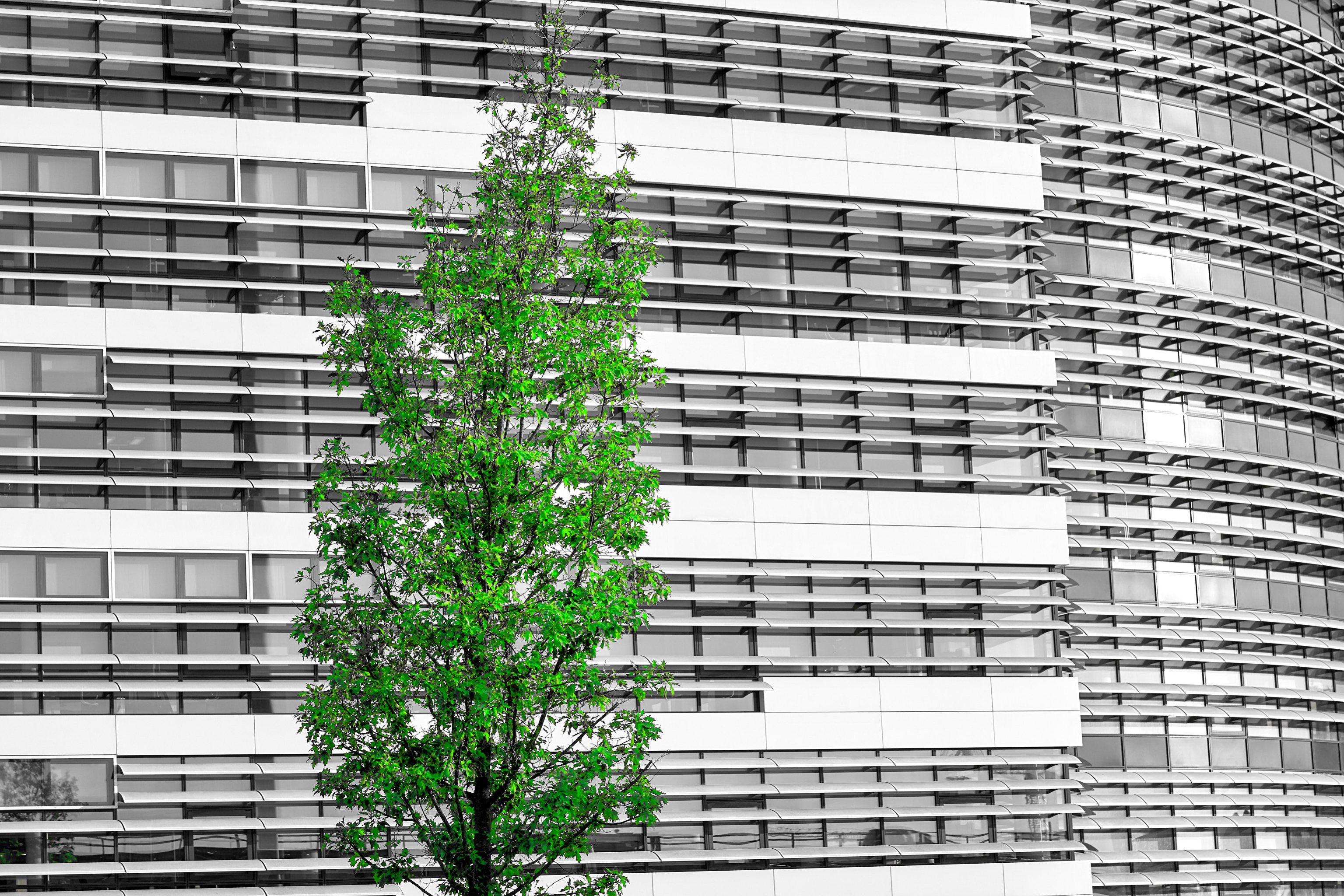 Fassade am Vodafone Campus in Düsseldorf. Wie ich inzwischen weiß, gibt es Kameras, die automatisch eine Farbe isolieren können (also den Rest des Bildes monochrom machen). Aber das hier ist natürlich Handarbeit… 😉
