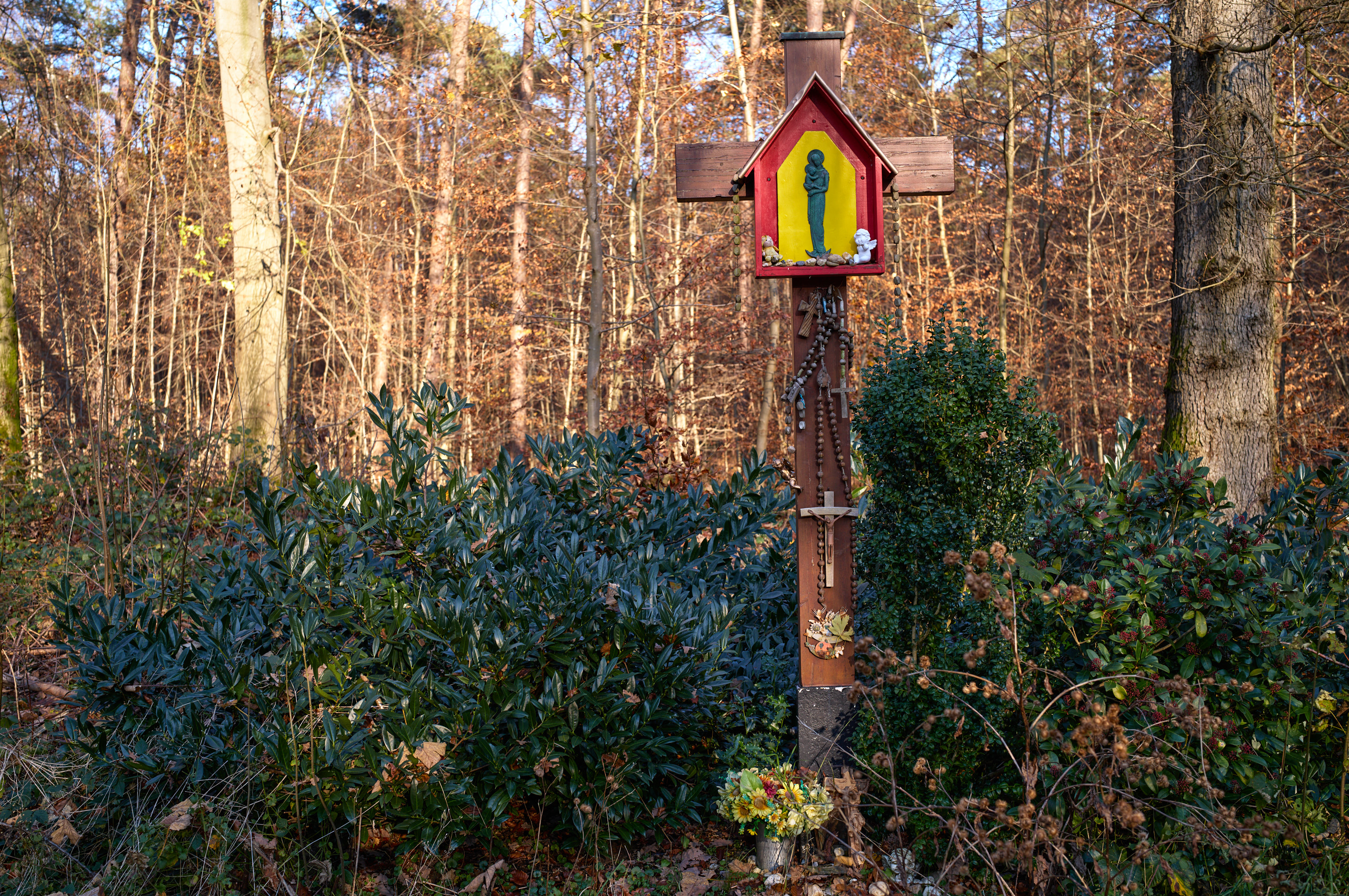 Wegkreuz im Wald bei Schwalmtal. Es ist vielleicht keine Landschaftsaufnahme im engeren Sinn, aber andererseits sind für meine Augen solche Ansichten ein Aspekt der hiesigen Landschaft, daher ist es in der entsprechenden Kategorie gelandet.