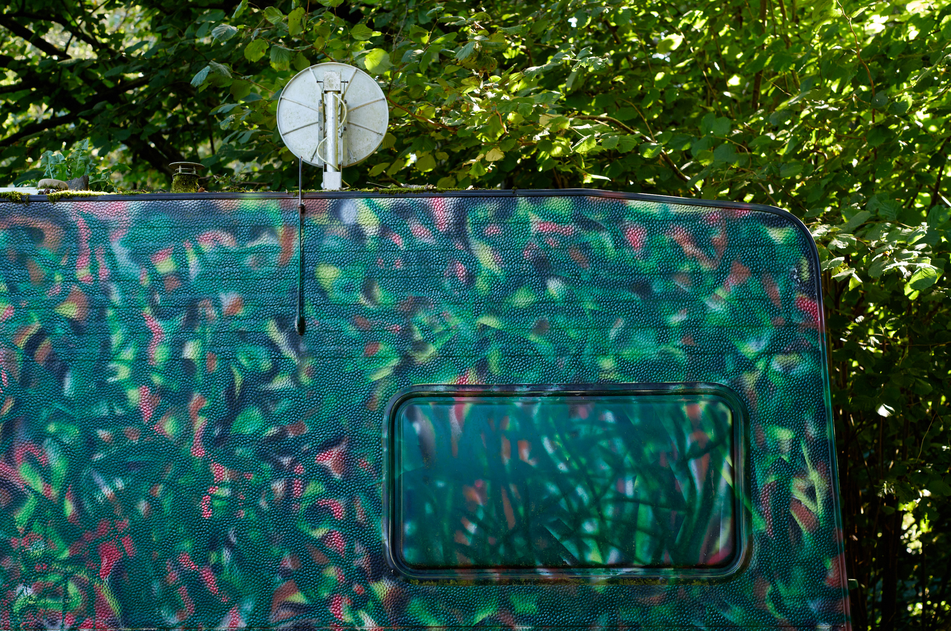 Ein vollständig bemalter Wohnwagen (offenbar ein Kunstwerk), irgendwo zwischen Schwalmtal und Niederkrüchten.